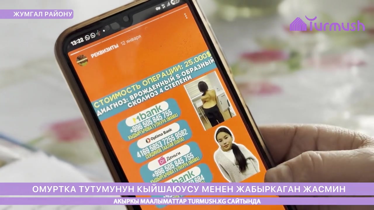 Нарын облусунун Жумгал районунун Кызыл-Жылдыз айылынын тургуну Жасмин Маратова омуртканын кыйшаюусунан жабыркап келет. Ага март айынын башы менен Туркияда операция жасалат.