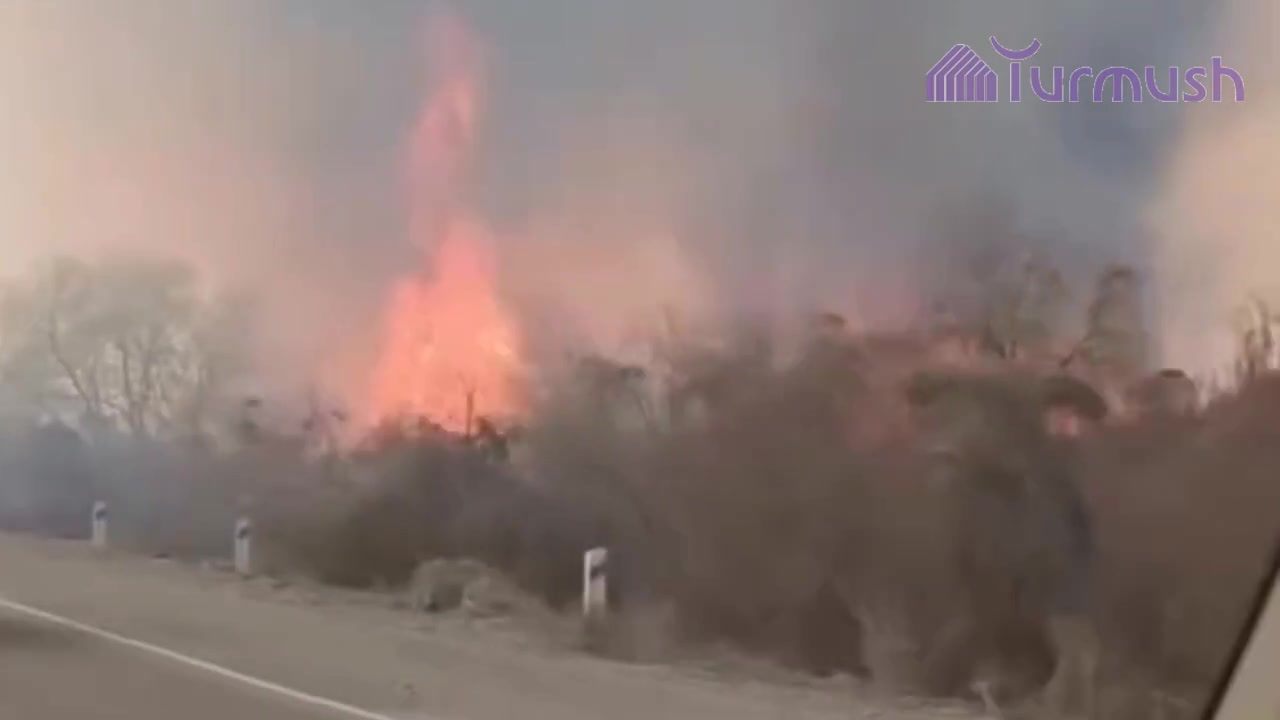 В селе Ивановка Иссык-Атинского района Чуйской области, на объездной дороге Бишкек—Нарын—Торугарт горят сухая трава и камыши в поле.